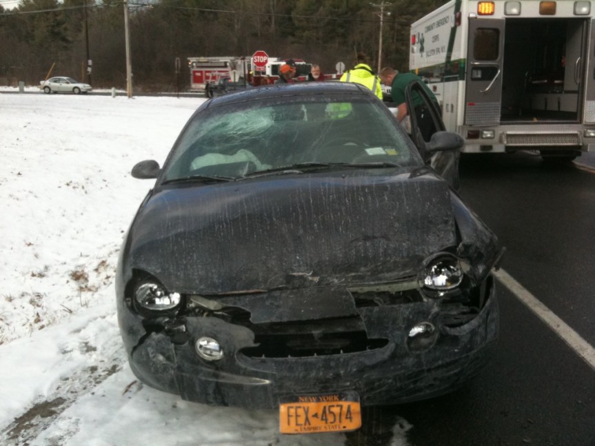 His car was pretty messed up. The windshield was impacted pretty hard on the passenger side, which was odd given that he didn’t have a passenger or any head cuts and was holding his chest like he’d hit the airbag & wheel. Apparently, the starring was from the unrestrained GPS in the front passenger seat. There’s a lesson in that for all you kids out there…