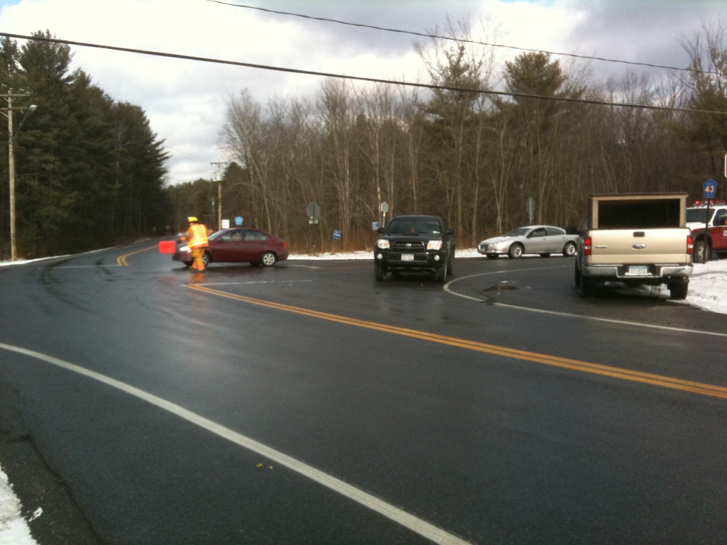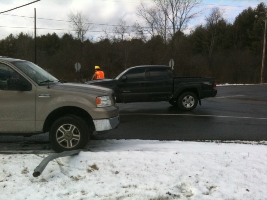 First, we were heading up Middle Line (or Middleline, depending on which sign you want to agree with on the subject of spelling), just getting ready to turn right onto Geyser Road to head to Saratoga. My brother had stopped at the stop sign, and a fellow in a pick-up who had the right-of-way started through the intersection. Some dude heading south on Middle Line blew through the stop sign and T-boned him, sending him spinning towards us. He wound up doing a 450+, parts flying everywhere, but didn’t actually hit us. So we pulled over (on top of one of the truck’s running boards, as it turns out), made sure everyone was alive & not bleeding and called 911. I actually pulled my phone out to call and answered an incoming call from my hairdresser, who I promptly hung up on.