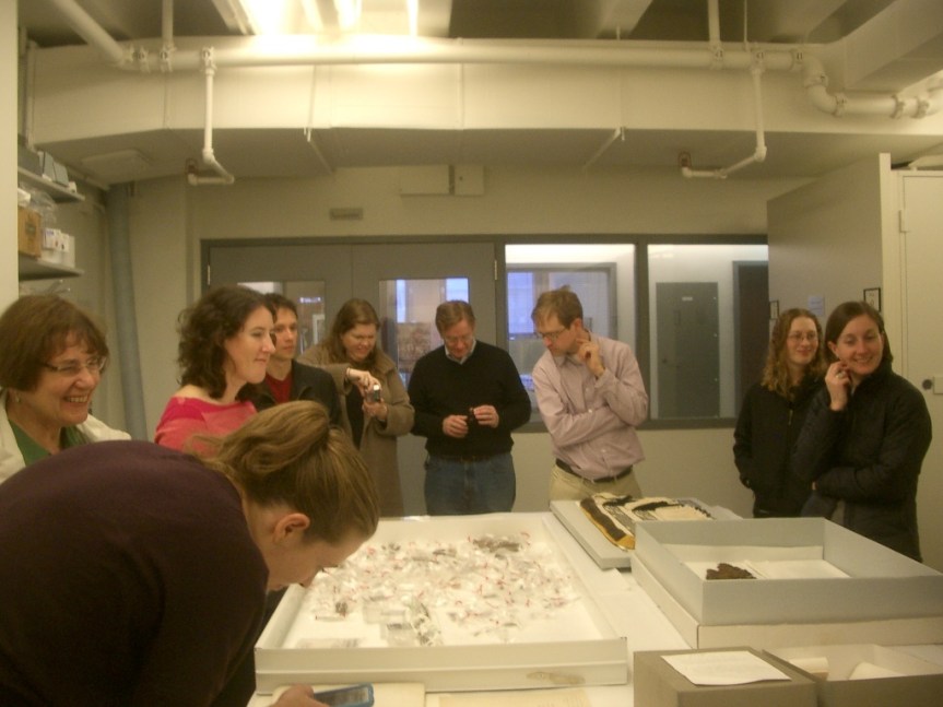 In the afternoon we took a bus in to the University Museum at Penn for a look at the collections.  William Wierzbowski, Associate Keeper of the American Section, has set things up for the visit.  He had gotten a number of items that had been collected by the late Frederica de Laguna, (BMC ’27: founder of the Bryn Mawr College Anthropology Department) in Alaska out and had arranged them as a temporary “ancestor shrine” for us.