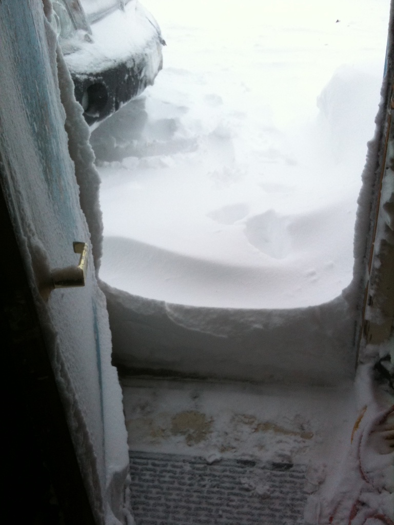 The wind was already rising and the barometer dropping again.  I went home at for a quick lunch, and there was already a drift at my door.