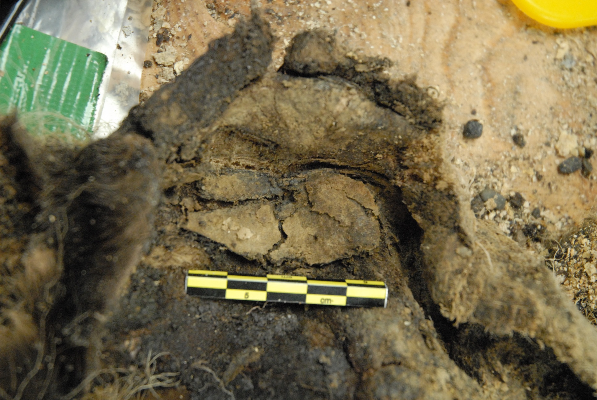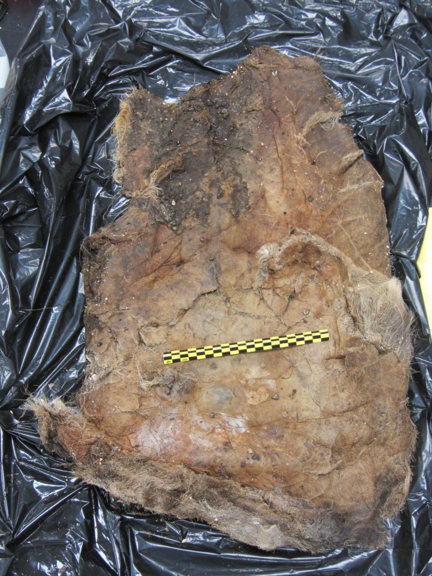 It took a bit of doing to get a look at the back, since it was fairly well stuck to the caribou hide underneath. I ended up getting Shawn to help me. We got a piece of Visqueen underneath the whole thing, very carefully, put plastic on top of it, and then put a piece of plywood on top to stabilize everything, held the plastic tight to the wood, and flipped everything. It worked well, and we were able to use the same method for the sewn wolf-skin item (still unidentified).