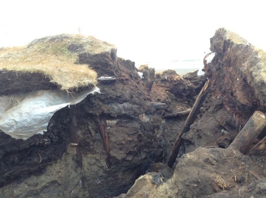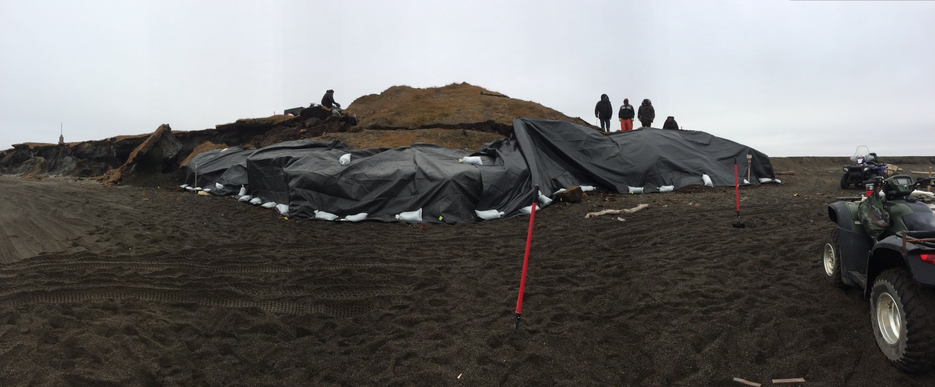 I went down with a crew from UIC Science Logistics to evaluate it.  We found that there had been a lot more Visqueen under the surface than we had thought.   The stratigraphy is very complex, with a very large feature containing solidified marine mammal oil, some artifacts and what appears to be maqtaq at the landward edge of the slump block.