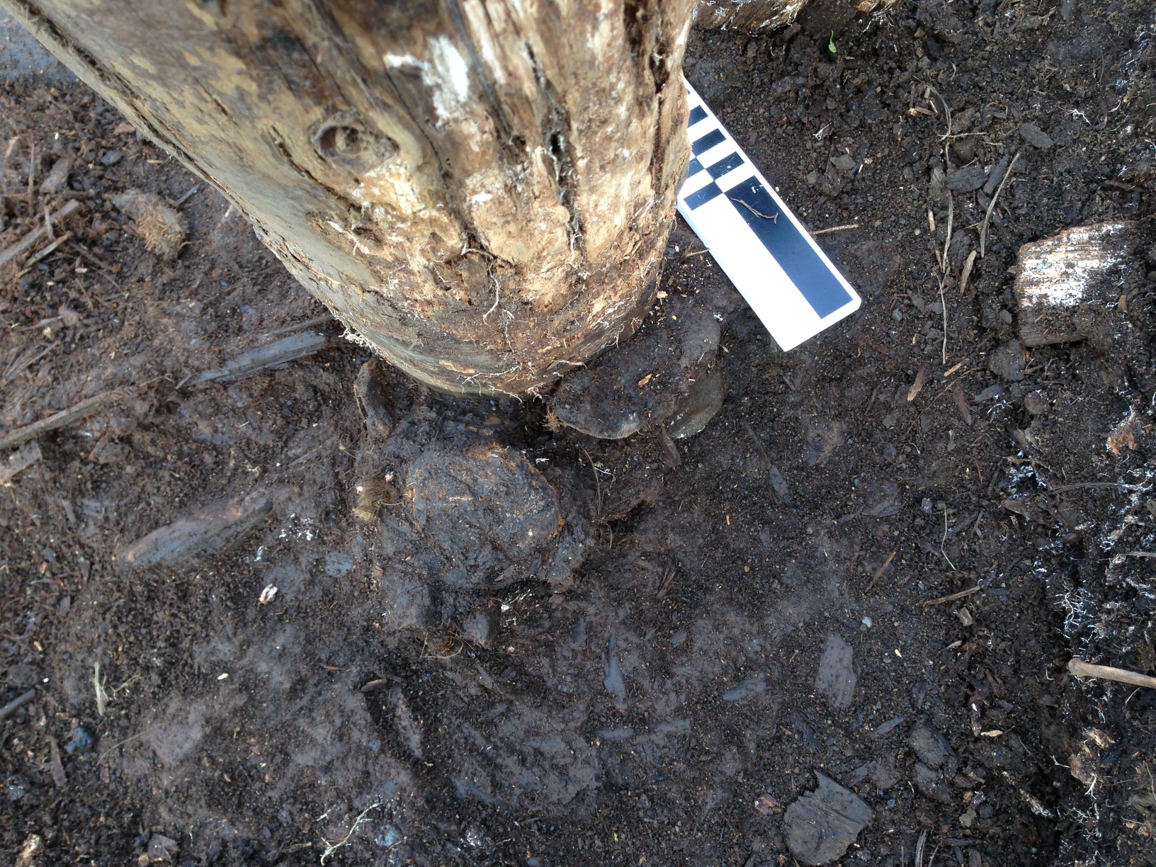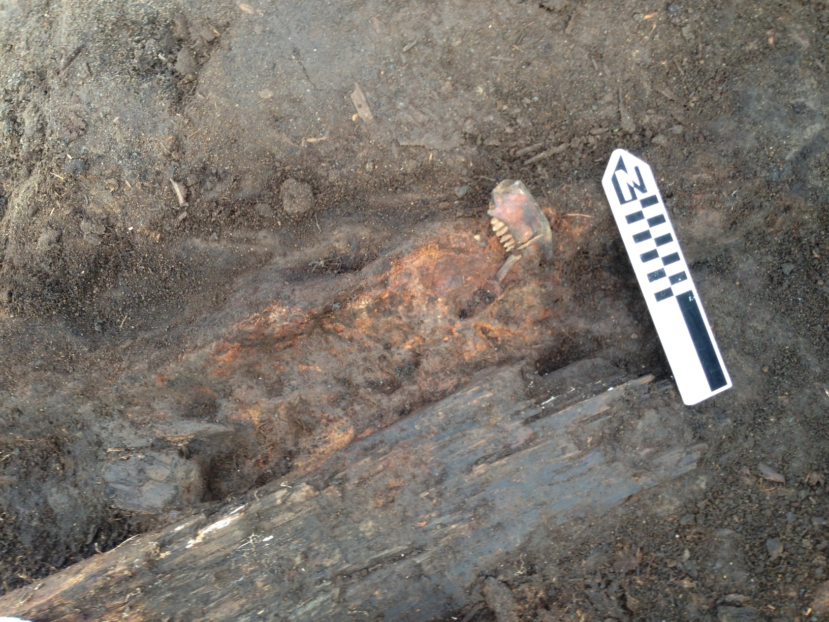 Post, showing sacrum and vertebra used as chocks.Post with pick used as chock at base to left of North arrow.A view of the excavation before the post and north logs came out. NO, the wall was not curved; this is a raw iPhone panorama shot, & that happens. Our walls are straighter than that!